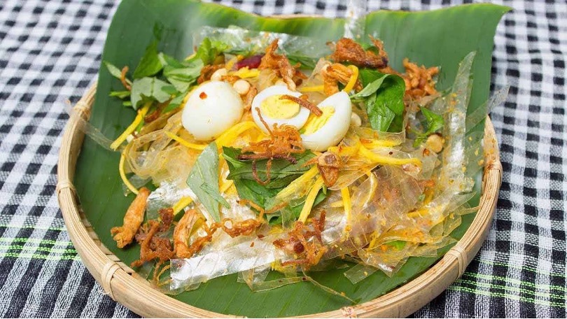 A typical serving of bánh tráng trộn includes shredded rice paper, grated green mango, quail eggs, dried shrimp, crispy fried shallots, Vietnamese coriander (rau răm), chili satay, and tamarind sauce. Once mixed together, the sour, spicy, salty, and sweet flavors blend harmoniously, creating a bold and irresistible taste that awakens the senses.