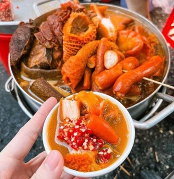 Phá lấu is a popular street snack with origins in Chinese cuisine, but it has been clearly “Saigonized” over time. Pork or beef offal is carefully cleaned and slowly braised in coconut milk with five-spice seasoning, resulting in a dish that is rich, aromatic, and slightly sweet.