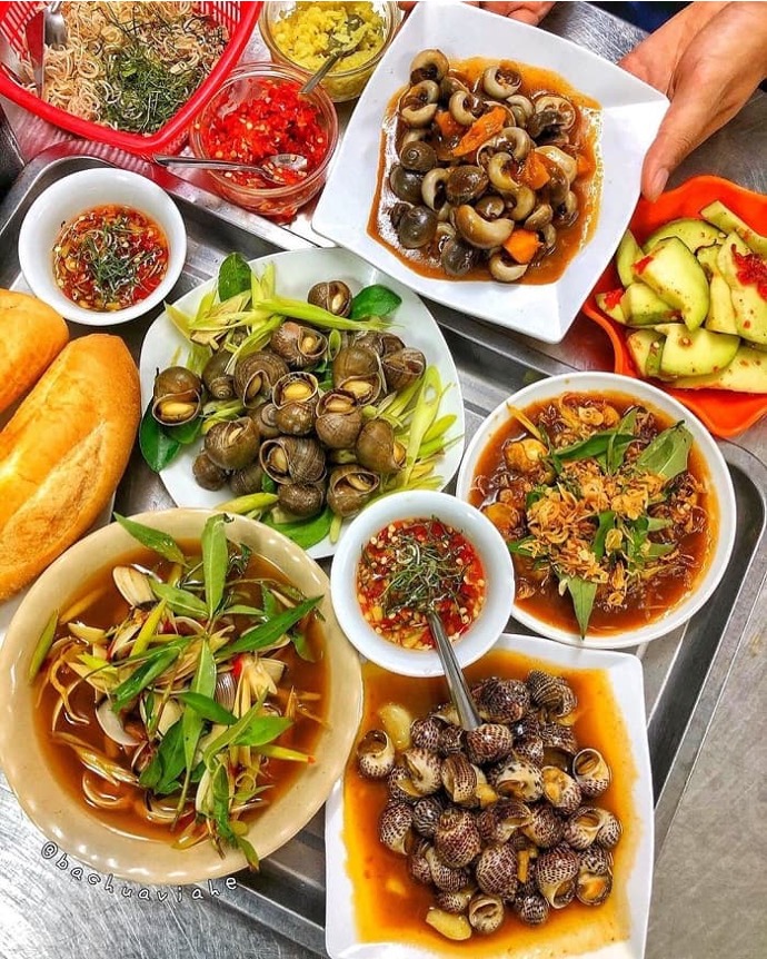 From boiled snails and steamed snails to stir-fried snails, along with clams, cockles, and oysters, each snail stall has its own signature seasoning recipe. Common ingredients include garlic, scallion oil, chili satay, pepper, and Vietnamese coriander—creating bold, addictive flavors that keep diners coming back.