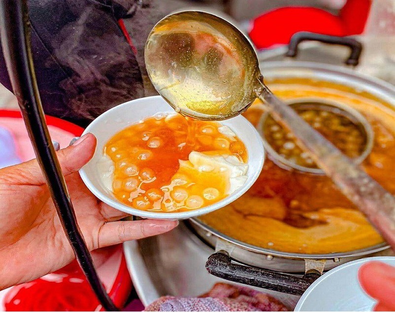 Tàu hũ (soybean pudding) is a street snack found throughout Saigon’s small alleys. Hot tàu hũ is soft and silky, gently fragrant with ginger, making it ideal for evening enjoyment. Iced tàu hũ is served with shaved ice, pandan sugar syrup, and coconut milk—perfect for cooling down on hot days.