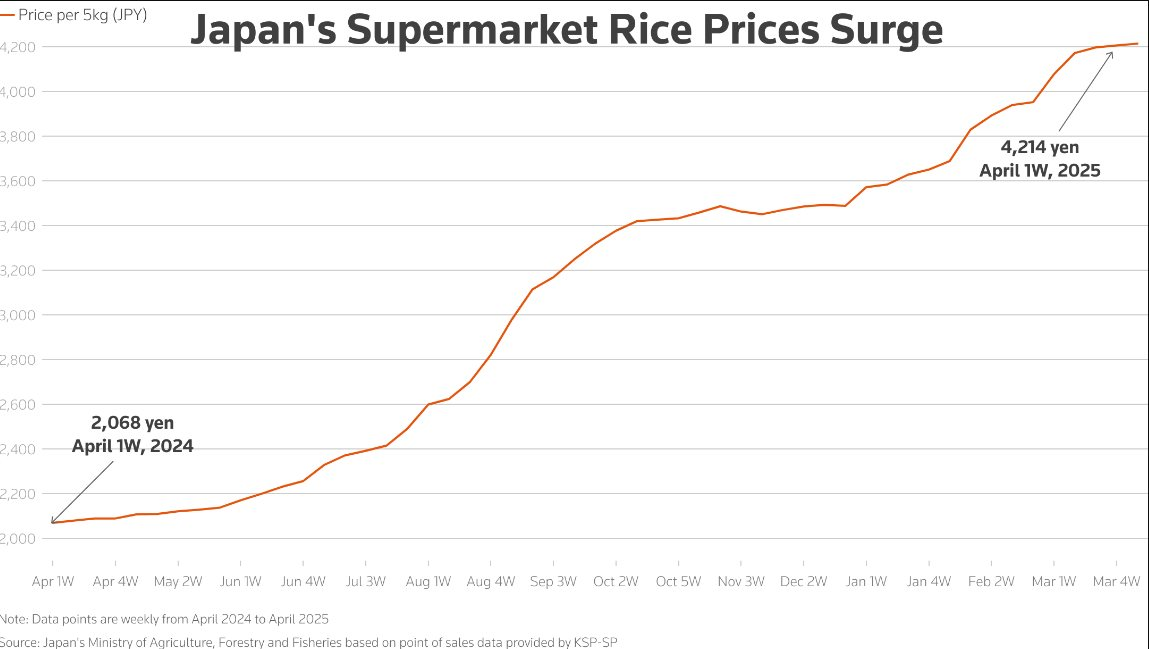 画像:2024年4月から2025年4月までの日本のスーパーマーケットにおける毎週のコメ価格の上昇。